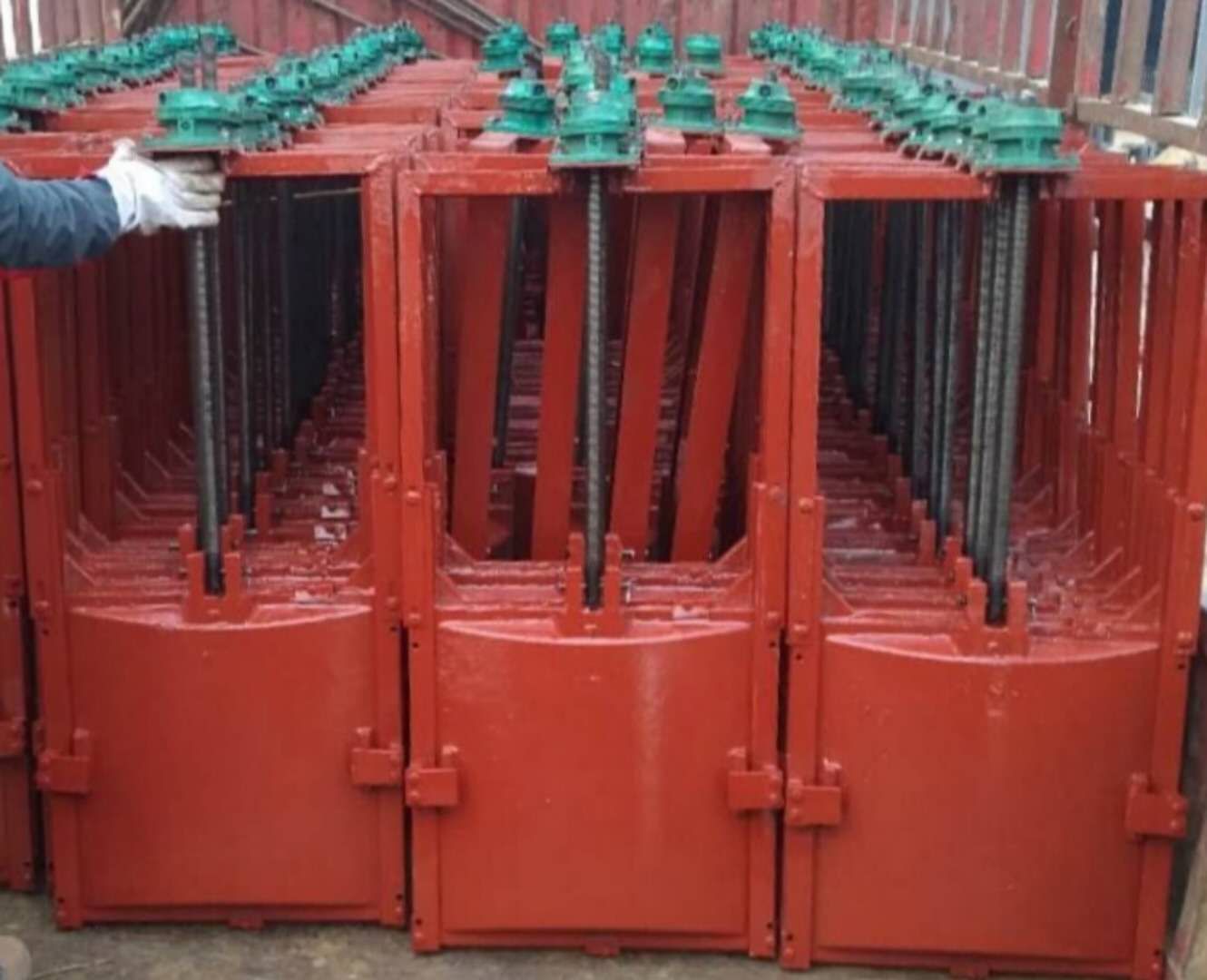 高標準農田整治水利設備第六批閘門啟閉機批量到貨了,這次到貨的有機閘一體閘門和配套閘門啟閉機,閘門啟閉機閘門主要用于給排水、防汛、灌溉、水利、水電工程中,用來截止、疏通水流或起調節(jié)水位的作用。它采用獨特的外弧形設計,結構合理、受力均勻,采用優(yōu)質灰口鑄鐵或球墨鑄鐵,并經精密加工后配研,達到平面接觸密封,密封性能好,當密封止水性能下降時,可通過楔塊裝置的調整加以解決。閘門為工作部分,啟閉機為閘門開啟與關閉的執(zhí)行部分,啟閉機由人力、電機或氣動、液壓機構帶動傳動裝置的齒輪、蝸輪蝸桿等運轉,驅動傳動螺母或螺桿轉動使閘軸作垂直升降運動,從而開啟或關閉閘門,達到放水、關水或調節(jié)水位的目的。