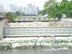 在水利水電建設(shè)中,隨著城市用水、景觀建設(shè)及環(huán)境整治和灌溉、發(fā)電的需要,翻板閘,水閘和橡膠壩得到廣泛的運(yùn)用。然而,橡膠壩等生產(chǎn)比較復(fù)雜,運(yùn)行時(shí)充水(充氣)升壩或放水(放氣)塌壩時(shí)間較長(zhǎng),影響快速截流或泄洪,再加上橡膠易老化的弊端,容易發(fā)生質(zhì)量事故。現(xiàn)在市場(chǎng)上出現(xiàn)大量鋼結(jié)構(gòu)閘門,或翻板閘但無(wú)論是提升式或臥倒式,單孔都很難適用較寬的河道。鋼壩閘是一種新型可調(diào)空控溢流閘門,它有土建結(jié)構(gòu)、帶固定軸的鋼閘門門體、啟閉設(shè)備等組成。這種建筑物適合于閘孔較寬(10米~~100米)而水位差比較小的工況(1~~7米),由于它可以設(shè)計(jì)的比較寬,可以省區(qū)數(shù)孔閘墩,所以不僅結(jié)構(gòu)簡(jiǎn)單,可以節(jié)省不少土建投資,而且可以立門蓄水,臥門行洪排澇,適當(dāng)開(kāi)啟調(diào)節(jié)水位,還可以利用閘門門頂過(guò)水,形成人工瀑布的景觀效果。